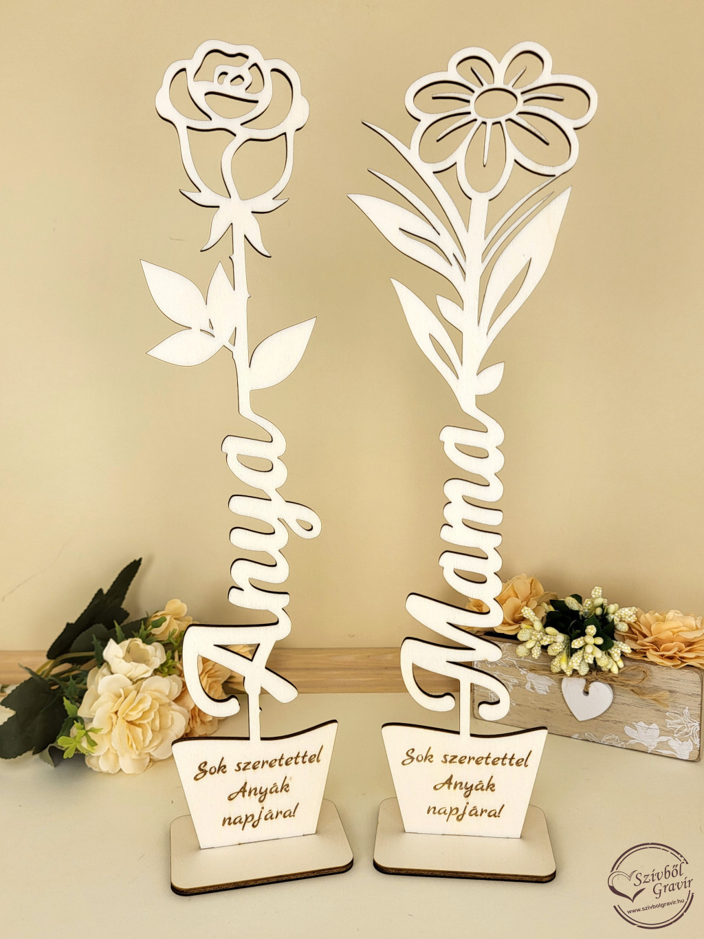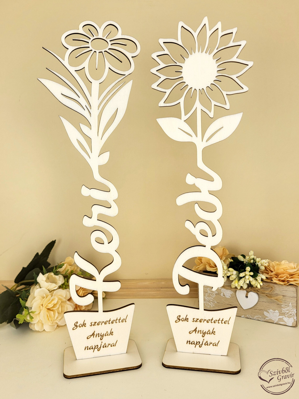 Ez az elegáns, fából készült virágdísz szívből jövő ajándék anyák napjára.