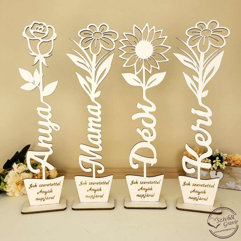 A virág szárába egy választott felirat kerül (például: Anyának, Mamának, Keresztanyának vagy Dédinek), az alsó részre pedig egy személyes üzenet gravírozható.